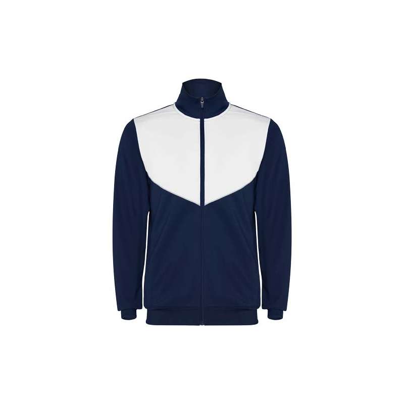 Tuta da ginnastica in tessuto leggero ed elastico. Giacca con colore a contrasto e finiture cucite sul petto. Colletto alto con cuciture a contrasto. Zip anteriore centrale. Tasche laterali. Polsini e vita a costine 2x2. Pantaloni con vita elasticizzata e coulisse. Parte laterale a contrasto con finiture cucite. Orlo con cerniera. Materiale: Maglia a costa incrociata 100% Poliestere, 225 g/m2