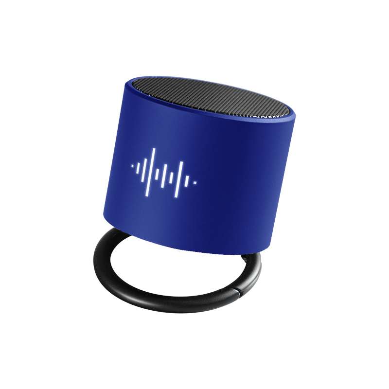 speaker bluetooth® wireless da 3 W, con logo luminoso e trattamento antibatterico. Doppia uscita audio per una qualità sonora senza pari per uno speaker di queste dimensioni. Lo speaker con anello può essere inclinato per dirigere il suono in qualsiasi direzione. Dotato di un microfono incorporato e funzione di chiamata in conferenza. Capacità: Batteria da 500 mAh - 3,7 V. Frequenza: 50 Hz - 20 KHz. Uscita audio: 1 x 3 W. Impedenza: 4 Ω. Bluetooth® 4.2. Peso netto: 100 grammi. Dimensione: ∅ 50 x 45 mm. Fornito in una confezione regalo con chiusura magnetica, realizzata in carta riciclata. Dimensioni: 4,5 x Ø 5 cm Materiale: Plastica ABS, Gomma, Metallo Tipo batteria: Built-in rechargeable batteries Diametro: 5 cm