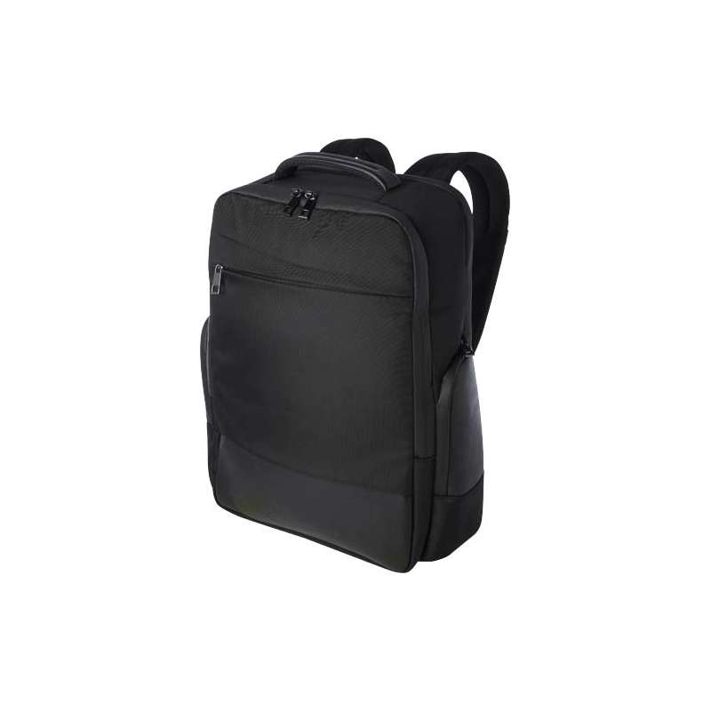 L\'elegante zaino per portatile Expedition Pro, ampio e resistente e realizzato in materiale riciclato certificato GRS, è l\'accessorio perfetto per i professionisti in viaggio. È realizzato in PET riciclato 900D idrorepellente, con elementi in PU di elevata qualità e fodera in PET riciclato. Presenta uno scomparto dedicato per portatile da 15,6\", una custodia per tablet, uno spazioso scomparto principale con tasca integrata a prova di perdite per gli articoli da toilette, numerose tasche con funzionalità organizzative e tasche laterali, una tasca anteriore con cerniera e una tasca nascosta proprio sotto la cinghia per il bagaglio sul retro. Dotato di spallacci imbottiti e regolabili, tasca integrata per le carte di credito, passante per occhiali da sole, pannello posteriore sagomato in rete traspirante e maniglia imbottita, garantisce il massimo comfort e comodità di trasporto. Capacità: 25 litri. Senza PVC. Dimensioni: 30 x 44,5 x 18,5 cm Materiale: 900D Poliestere riciclato certificato GRS
