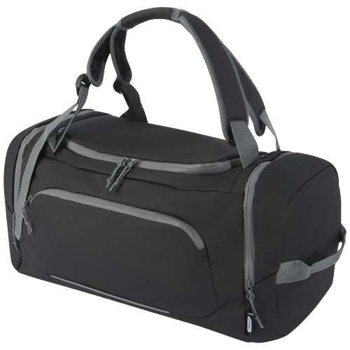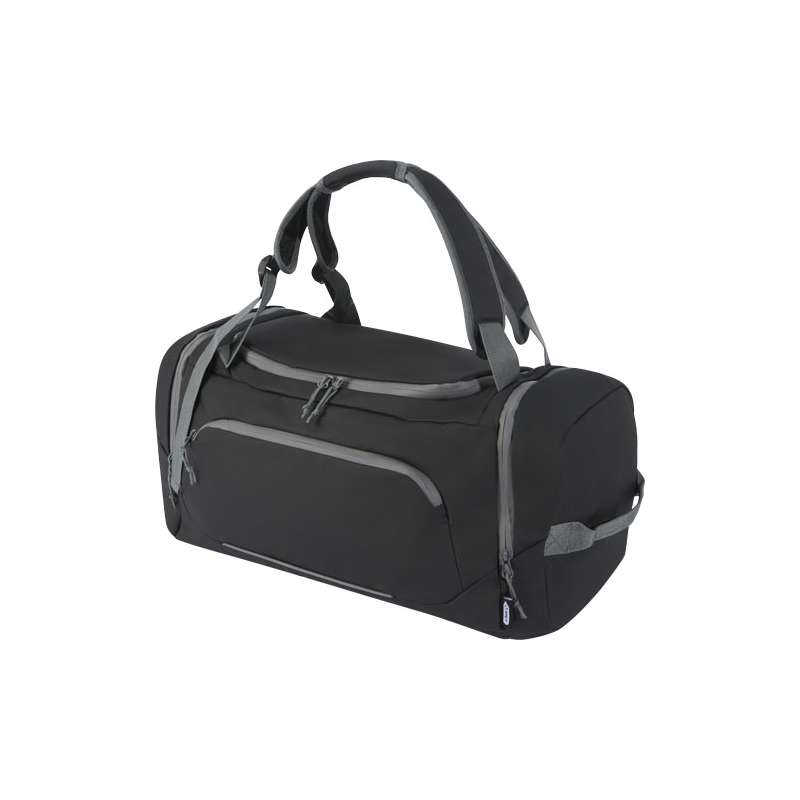 Borsone 2 in 1 impermeabile realizzato con materiali riciclati certificati GRS, comprese le cerniere. Presenta uno spazioso scomparto principale con apertura a forma di U per riporre e accedere facilmente agli oggetti, due tasche laterali con zip (compreso uno scomparto per le scarpe), una tasca anteriore con zip, una tasca in rete per la borraccia sul retro e un bordino catarifrangente per una maggiore visibilità. Questo borsone può essere trasportato in 3 modi diversi: A mano, a tracolla oppure come uno zaino grazie agli spallacci imbottiti regolabili. I materiali riciclati certificati GRS includono il tessuto principale, la fodera, la cinghia e le cerniere. Capacità: 35 litri. Senza PVC. Dimensioni: 47 x 29 x 28 cm Materiale: 600D Poliestere riciclato certificato GRS