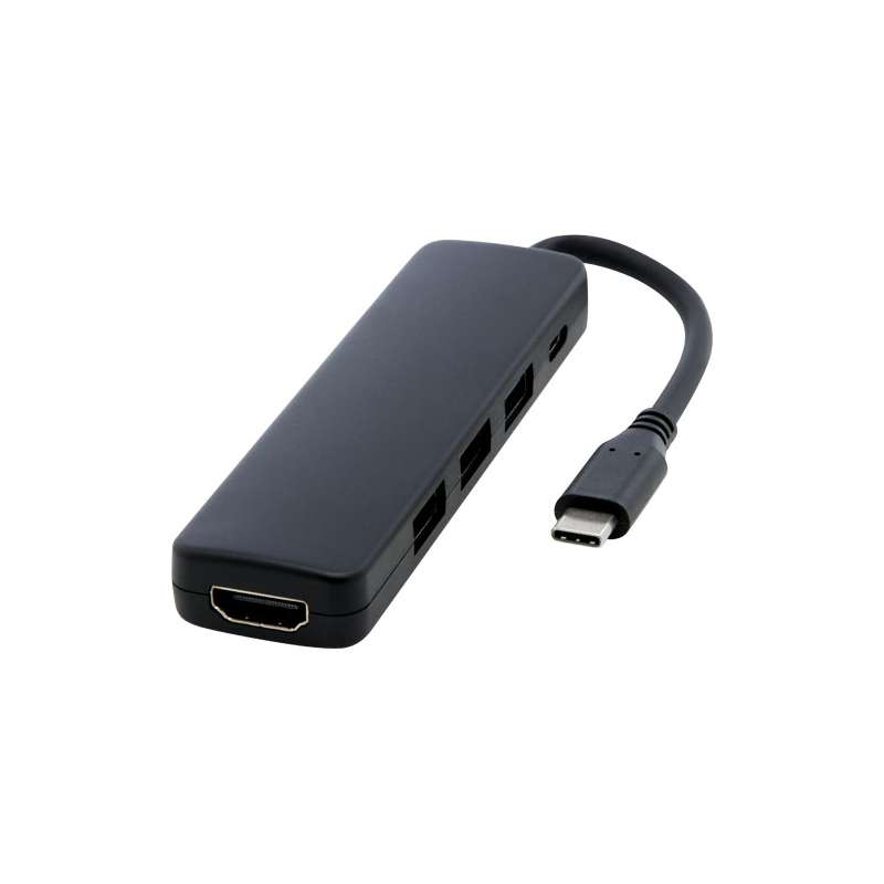 L\'adattatore multimediale USB Tipo-C Loop in plastica riciclata certificata RCS offre una soluzione per qualsiasi esigenza grazie alla varietà di porte. È possibile collegare un mouse e una tastiera alle 2 porte USB 2.0, copiare file di grandi dimensioni ad alta velocità tramite la porta USB 3.0 o Tipo-C e/o collegare il portatile a un monitor/TV/proiettore esterno utilizzando l\'uscita HDMI integrata con supporto video fino a una risoluzione 4K. Fornito con un manuale utente in una scatola di carta kraft riciclata al 100%. Dimensioni: 9 x 1,3 x 3 cm Materiale: Plastica ABS riciclata