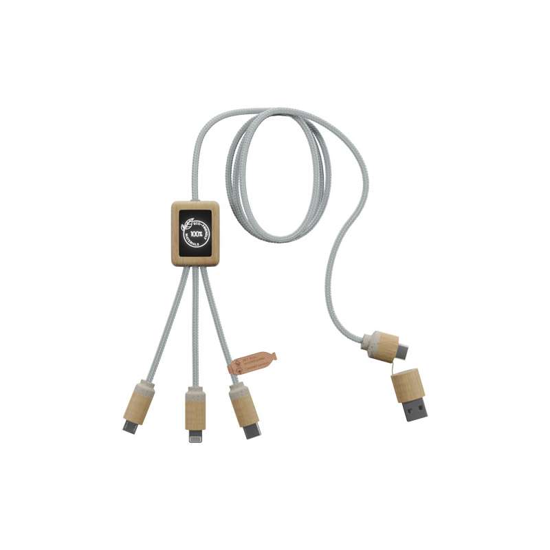 Cavo di ricarica rapida da 2,4 A (3 x 10 cm) personalizzabile con logo luminoso su entrambi i lati, che possono anche essere diversi l'uno dall'altro. Questo cavo è interamente realizzato con materiali più sostenibili: cordini in PET riciclato, bambù, fibre di grano e plastica riciclata. Il cavo di ricarica è realizzato per essere universale grazie alle sue 3 uscite (tipo C, Android, iPhone), e può caricare fino a tre dispositivi contemporaneamente. Grazie al doppio ingresso USB e USB-C, questo cavo è compatibile con i caricabatterie più recenti. Fornito in un astuccio di cotone (20 x 8 cm), con un biglietto in carta kraft. Dimensioni: 20 x 2 x 8 cm Materiale: Plastica PET riciclata, Legno di bambù