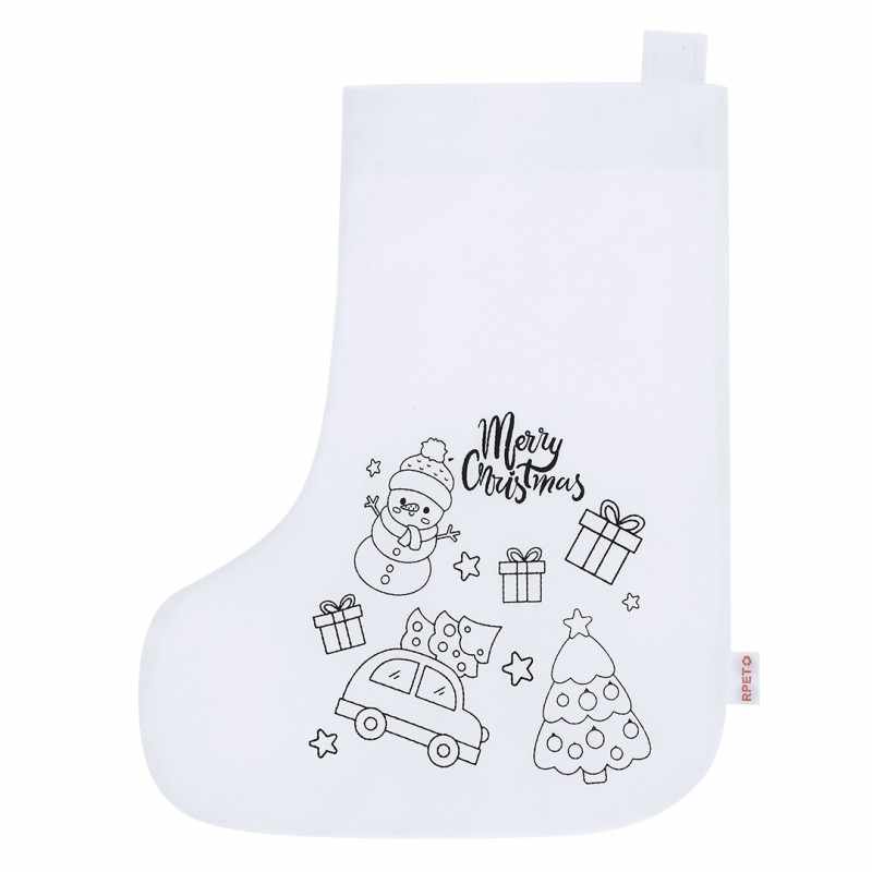 Calzino in RPET non tessuto in bianco, appositamente progettato per colorare con i pastelli. Design frontale con divertenti disegni natalizi, inclusi 5 pastelli in diversi colori. Fornito con un nastro appendibile, finitura termosaldata. Etichetta RPET all'esterno. Il materiale RPET è realizzato in plastica riciclata, promuovendo così il riutilizzo dei rifiuti di plastica e contribuendo alla sostenibilità del pianeta.