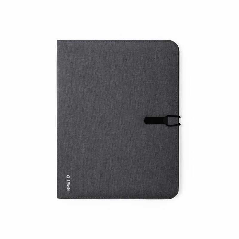 Elegante cartella della linea natura in formato A4. Realizzato in resistente RPET 600D effetto melange, plastica riciclata per favorire il riutilizzo dei rifiuti plastici e contribuire alla sostenibilità del pianeta. Dettagli neri e chiusura in metallo con nastro elastico appositamente progettato per la stampa laser. Interno con taccuino rimovibile da 20 fogli a righe singola, 3 tasche con patta, portacarte e portapenne. Etichetta distintiva con logo RPET nell'angolo.