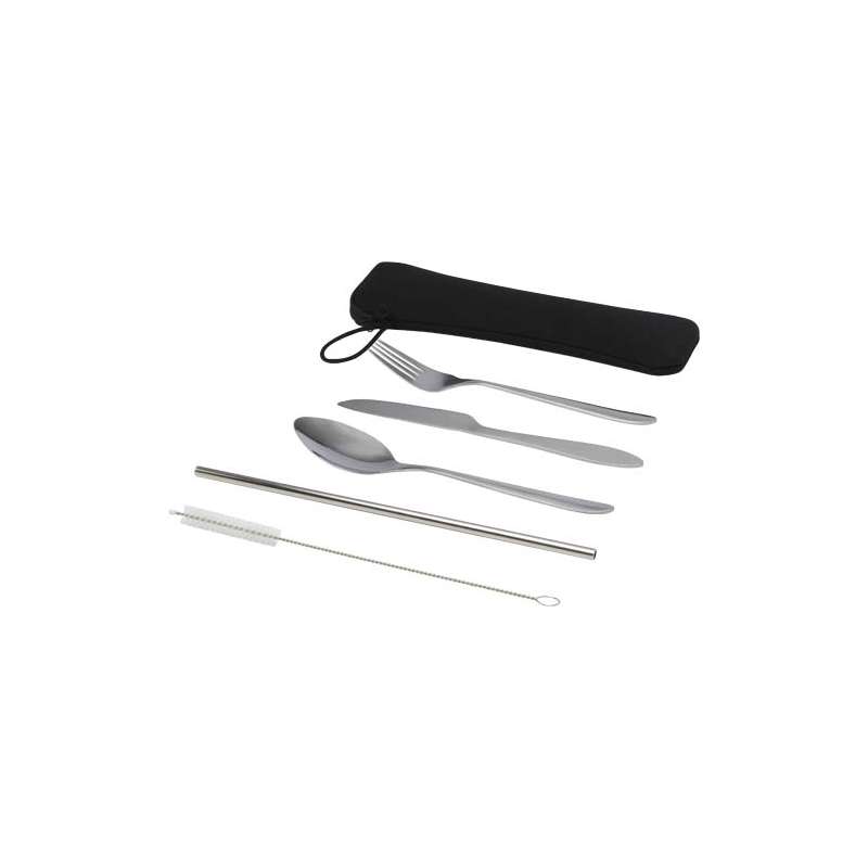Le posate sono composte da forchetta, coltello, cucchiaio, cannuccia e spazzola per la pulizia, tutti realizzati in resistente acciaio inossidabile. Facili da pulire e pratiche da trasportare, le posate vengono fornite in una comoda custodia in poliestere con cerniera e passante.