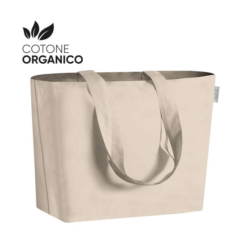Grazie alle sue dimensioni generose (Cm 32x24x10) e al pratico soffietto, questo shopper offre un'ampia capacità di carico, rendendolo perfetto per la spesa, l'uso quotidiano o come Gadget promozionale per eventi aziendali.