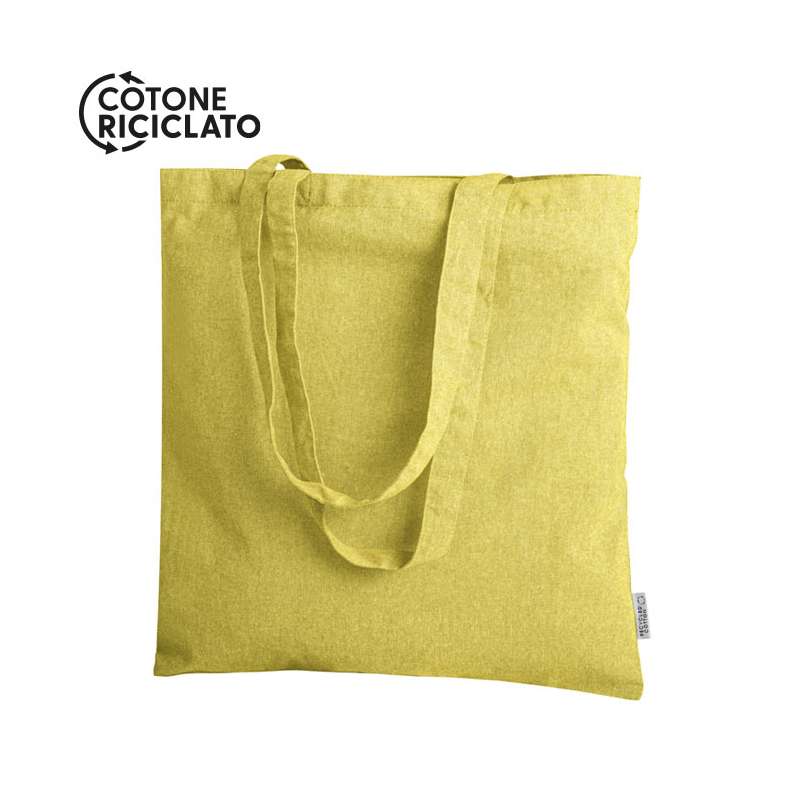 Borsa con fondo realizzata principalmente in cotone riciclato di 140g/m2. Dotata di doppio manico: manici lunghi di 70 x 2,5 cm e manici corti di 30 x 2,5 cm. Include il distintivo di Cotone Riciclato. Resistenza fino a 6 kg di peso.