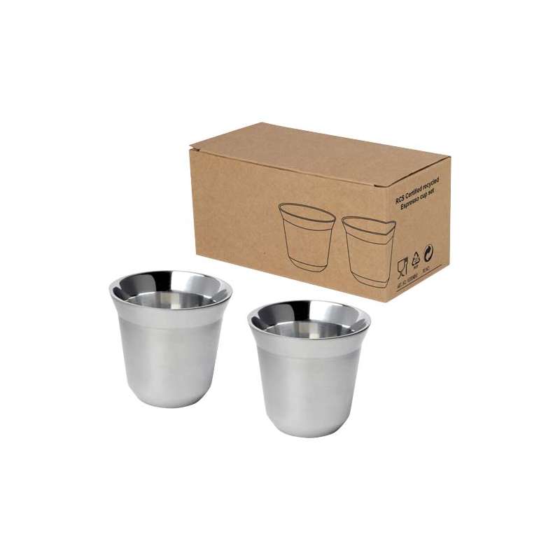 Queste tazzine sono fornite in una elegante confezione regalo in cartone riciclato, ideale anche per regali aziendali o promozionali. Le dimensioni compatte (6,2 x 6 x 6,2 x Ø 6,2 cm) le rendono perfette per l'uso quotidiano in ufficio, a casa o in viaggio. Il materiale riciclato certificato RCS al 91% garantisce un impatto ambientale ridotto, contribuendo alla sostenibilità del tuo marchio.