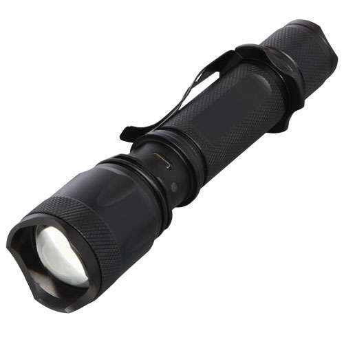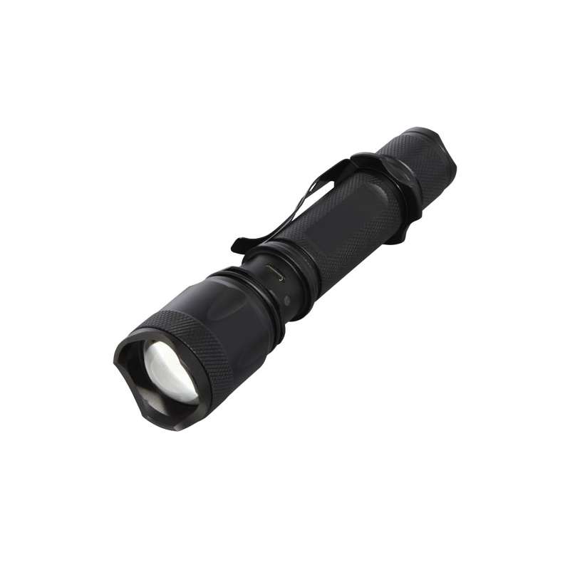 Questa torcia militare ricaricabile in alluminio ad alta potenza non si scarica praticamente mai. Il solido alloggiamento in lega di alluminio nero conferisce un look professionale e resistenza alle cadute da 1 metro di altezza. Grazie alla clip da cintura, la torcia è facilmente trasportabile ed è resistente agli spruzzi con un grado di protezione IPX4. La luce a LED da 5 W genera 300 lumen per massimo 3 ore, nonché un fascio luminoso di 200 metri con 5 diverse modalità di illuminazione: alta, media, bassa, intermittente e SOS. L\'elevata potenza è data da una batteria al litio integrata, la cui capacità è di 2000 mAh. La torcia ha dimensioni pari a 14,5 x 3,4 cm e pesa solo 170 grammi. Viene fornita con un manuale di istruzioni ed è racchiusa in una confezione regalo in cartone riciclato di dimensioni pari a 17,5 x 6 x 4 cm. Si consiglia l\'incisione laser sulla struttura in alluminio.\n Dimensioni: 17,5 x 4 x 6 cm Materiale: Alluminio Tipo batteria: Lithium