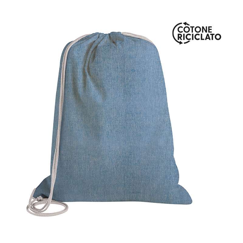 Sacca della linea natura in cotone riciclato al da 200g/m2. Con chiusura a coulisse in cotone e robusti anelli in metallo. Disponibile in un'ampia gamma di colori, con etichetta esterna cotone riciclato.Con certificazione GRS (Global Recycled Standard), che garantisce l'origine riciclata del materiale utilizzato per la fabbricazione del prodotto.
